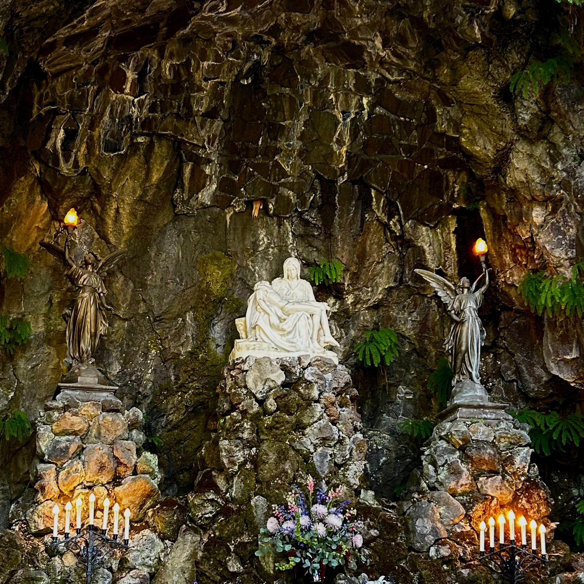 We continue walking until we come before the Sorrowful Mother surrounded by bouquets of daisies. Cheap flowers for such an important lady. There are candles burning on either side of us, I say something like a joke and then notice you are crying. “Oh, don’t cry,” then something like, “I know sorrow, I know her, I am the mother,” I’m pointing. She is a stone altar stuck inside a cliff, she is there at the center of a dozen rows of benches that are empty. We are here because I wanted to come, and it looks how I imagined but it feels differently.